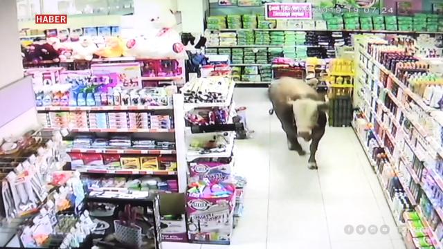 Adıyaman'da, kamyonetin kasasından kaçan kurbanlık dananın markete girmesi güvenlik kameralarınca kaydedildi.