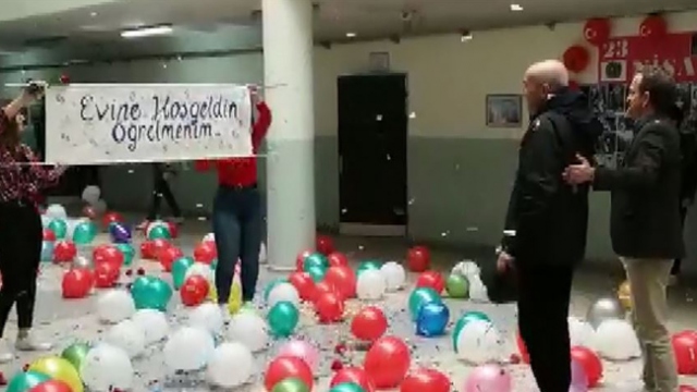 Çorlu'da kanser tedavisi nedeniyle 8 ay öğrencilerinden ayrı kalan coğrafya öğretmeni Muharrem Poyrazoğlu, okul koridorunda konfeti ve balonlarla karşılandı.