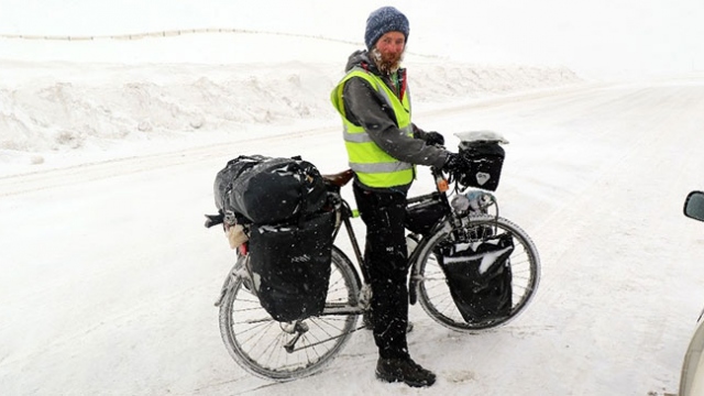 Sivas-Erzincan karayolu üzerindeki Kızıldağ geçidini, donduran soğuk ve tipi nedeniyle kış aylarında otomobiller geçmeye cesaret edemezken, Çekyalı turist bisikleti ile geçti.