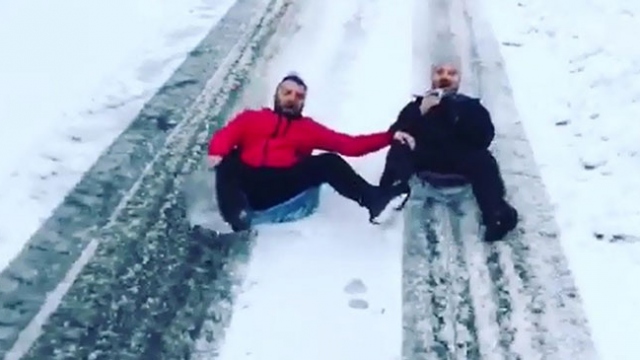 Artvin'de yüksek kesimlerde etkili olan kar yağışını fırsat bilen bazı vatandaşlar, kamyonetin arkasına leğen bağlayarak kaydı.
