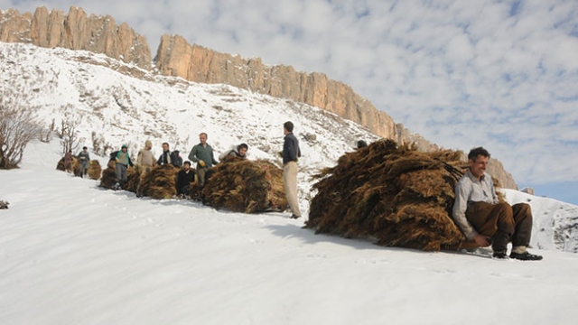 Karlı dağlardan hayvanlarına kızaklarla ot taşıyorlar