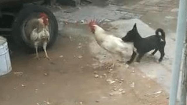 Kavga eden horozları ayırmaya çalışan yavru köpeğin çabası güldürdü