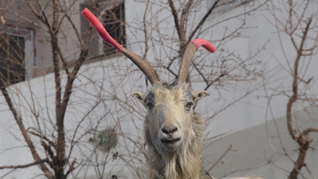 Şırnak'ın Beytüşşebap ilçesinde bir çiftçi, birbirlerini boynuzlayan keçilere ilginç bir çözüm buldu, boynuzlarına hortum taktı.