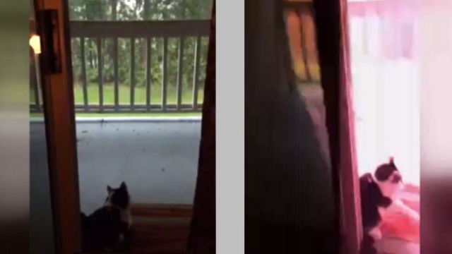 Kedinin yağmur izleme keyfi çakan şimşekle bozuldu. O anlar kameraya böyle yansıdı. Başına geleceklerden habersiz olan kedi, balkon kapısında oturmuş, yağmuru seyrediyordu.