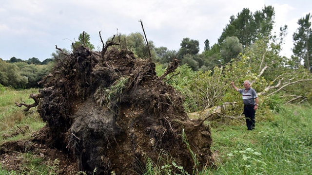 Kırklareli'nin Pınarhisar ilçesinde oluşan hortum, ekili alanlara zarar verdi, ağaçları kökünden söktü.