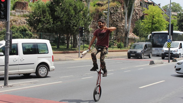 İstanbul Fatih'te trafik ışıklarında bekleyen sürücüler, ilginç bir gösteriye şahitlik ediyor. Arjantili Emanuel Dante, kırmızı ışıklarda bekleyen sürücüler için gösteri sunuyor.