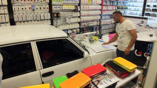Yozgat'ta kontrolden çıkan otomobil, cep telefonu aksesuarı satışı yapılan mağazaya girdi. Olayla ilgili güvenlik kamerası görüntüleri ortaya çıktı.