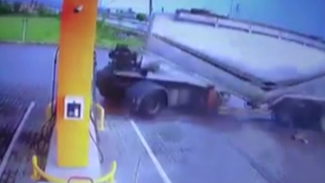 Elazığ'da facia ucuz atlatıldı. Sürücüsünün direksiyon hakimiyetini kaybettiği tanker benzinliğe girdi. O anlarda güvenlik kameraları kayıttaydı.