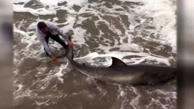 Amerika Birleşik Devletleri'nin Kaliforniya eyaletinde dev bir köpek balığı kıyıya vurdu. Köpek balığını denize döndürme çabaları sonuçsuz kaldı.