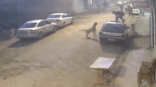 Sivas'ın Gemerek ilçesinde, sokak köpeklerinin saldırdığı kişi, park halindeki aracın üzerine çıkarak kurtulmayı başardı. Olay anı, bir iş yerinin güvenlik kamerasınca kaydedildi