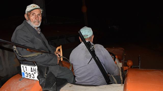 Bilecik Gölpazarı'na bağlı Çukurören Köyü'nde, yaşları 75 ile 86 arasında değişen dedeler, ayçiçeği ve buğday tarlalarına zarar veren yaban domuzlarına karşı nöbet tutuyor.