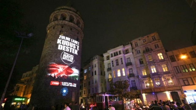 Filistin'e destek amacıyla bugün düzenlenecek "Zulme Lanet Kudüs'e Destek" mitinginin afişi, Galata Kulesi'ne yansıtıldı.