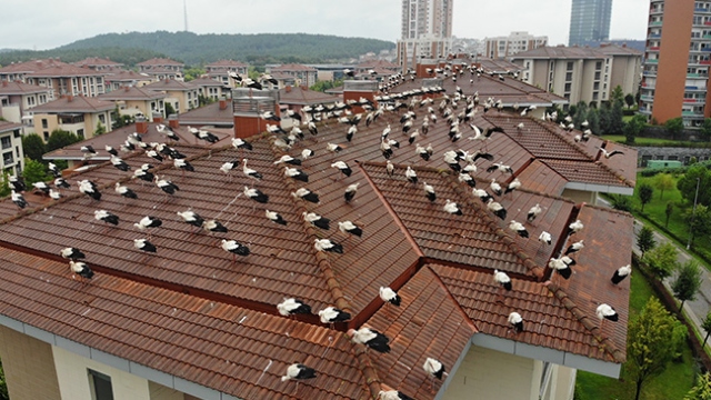 İstanbul Ümraniye’de göçe mola veren onlarca leylek yağmurun dinmesini bekledi.