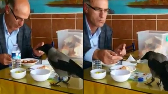 Lokantada masasına konan kargayla yemeğini paylaştı