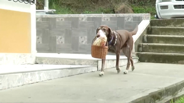 Kolombiya'da Labrador cinsi köpek, market işleten sahibinin müşterilerine ürün teslimatı yapıyor.