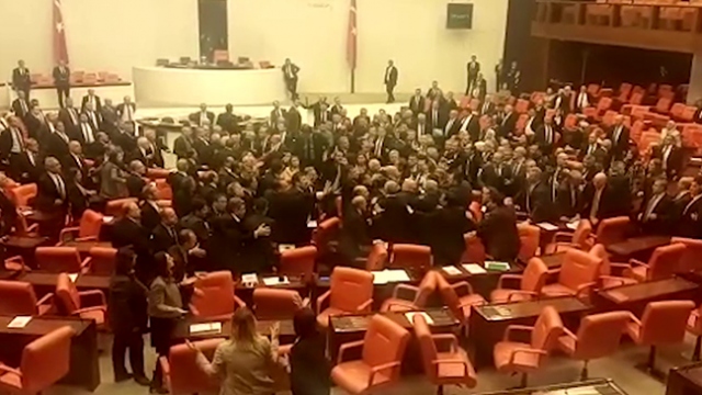 AK Partili milletvekilleri, CHP Sakarya Milletvekili Engin Özkoç'un, Cumhurbaşkanı Recep Tayyip Erdoğan hakkındaki ifadelerine tepki gösterdi. Çıkan arbede sonucu Genel Kurul'a ara verildi.