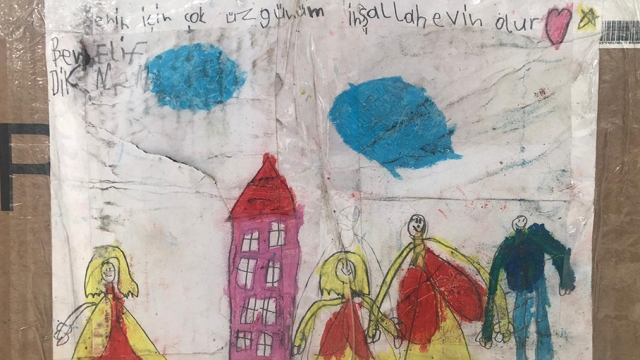 Elazığ'daki depremzedelere yurdun dört bir yanından yardım gönderiliyor. O yardımlardan bir tanesi de küçük Elif'e ait. Gönderdiği yardım kolisine "Senin için çok üzgünüm, inşallah evin olur" yazan Elif kendi yaptığı resmide koliye yapıştırdı.
