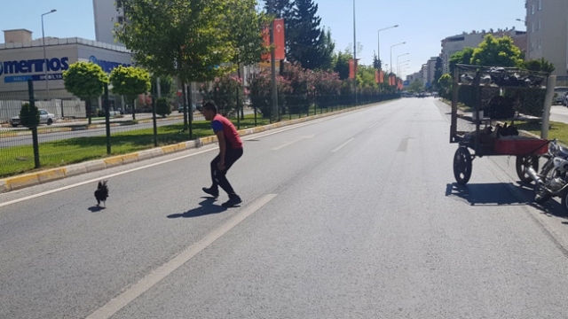 Motosiklet sürücüsü karayolunda tavuk kovaladı