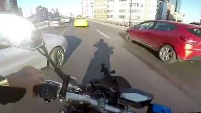 İstanbul Mecidiyeköy mevkiinde seyir halinde olan otomobil sürücüsü, aniden duran trafikte frene basınca kontrolünü kaybederek motosikletliye çarptı. Motosikletli ölümden döndü.
