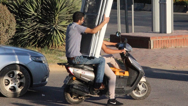 Kilis'te motosikletteki 2 kişinin aralarına bir kapı yerleştirerek taşıması pes dedirtti.