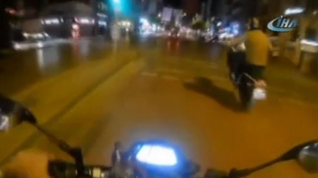İstanbul Mecidiyeköy'de bir grup motosikletlinin trafikteki şovu kazayla bitti. Motosikletin arka tekerleğini havaya kaldıran sürücü dengesini kaybederek, büyük tehlike atlattı.