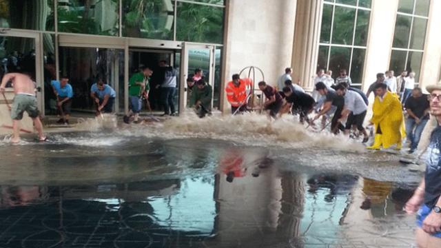 Muğla'nın Bodrum ilçesinde etkili olan sağanakta kara yolu trafiğe kapandı, su taşkınları meydana geldi.