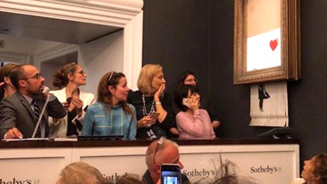 İngiliz grafiti sanatçısı Banksy'nin müzayedede 1,4 milyon dolara alıcı bulan "Balonlu Kız" isimli eseri, sanatçının daha önce tabloya gizlediği öğütücünün çalışmasıyla parçalandı.