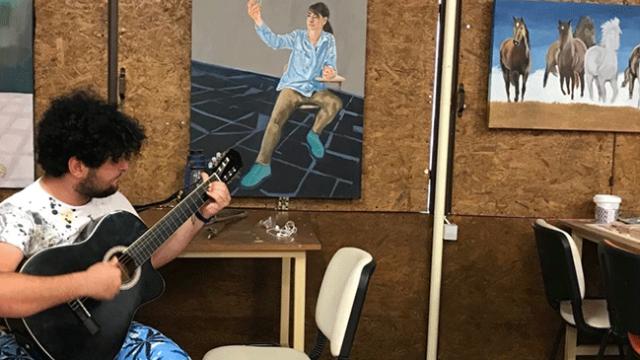 Tekirdağ Süleymanpaşa'da resim kursuna katılan bir grup genç, yeteneklerini tuvallere aktarıyor. Gençlerin gitar çalan arkadaşları da onlara müzikle ilham veriyor.