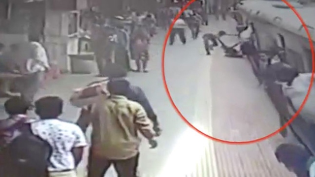 Hindistan Mumbai'de elbisesi trene takılan kadın, ölümden döndü.