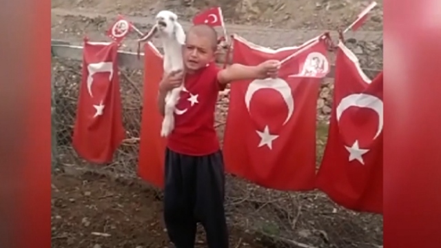Mersin'de omzunda kuzu, elinde Türk bayrağıyla 23 Nisan şiiri okuyan İsmail Alperen Töstü sosyal medyada ilgi gördü.