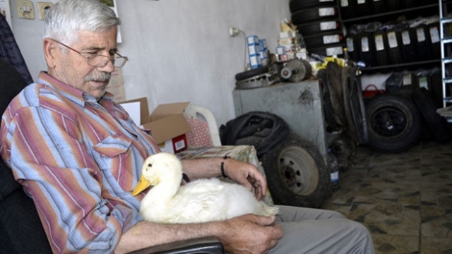 Zonguldak Alaplı'da lastik tamircisi Servet Arıkan'ın beslediği ördekle dostluğu görenleri şaşırtıyor.