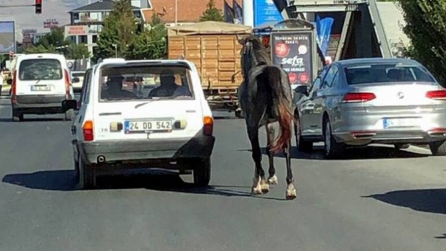 Erzincan’da iki kişi otomobile bağladıkları atı trafiğe aldırış etmeden kilometrelerce koşturdular.