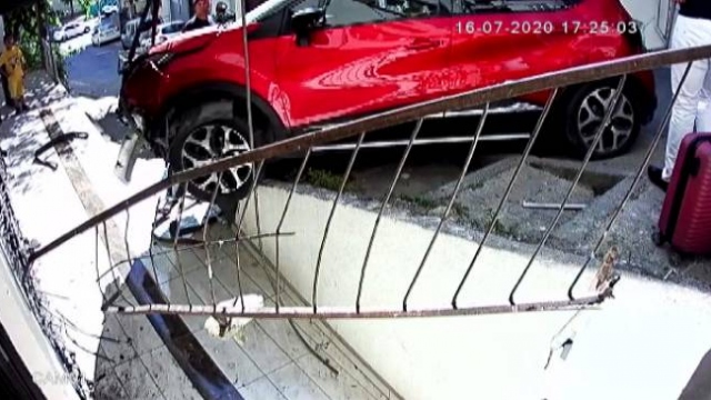 İstanbul Gaziosmanpaşa'da sürücüsünün direksiyon hakimiyetini kaybettiği otomobil, korkuluk demirlerini aşarak bir binanın ön cephesine çarptı. Güvenlik kamerasına yansıyan kazadan bina önünde oynayan çocuklar son anda kurtuldu.