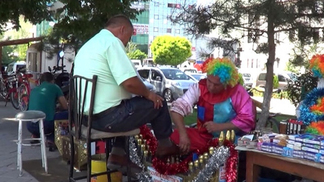 Iğdır'da 35 yıldır ayakkabı boyacılığı yapan Nurettin Akkuş, müşterilerinin ilgisini çekmek için farklı bir yol buldu. Akkuş, palyaço kostümüyle ayakkabı boyuyor.