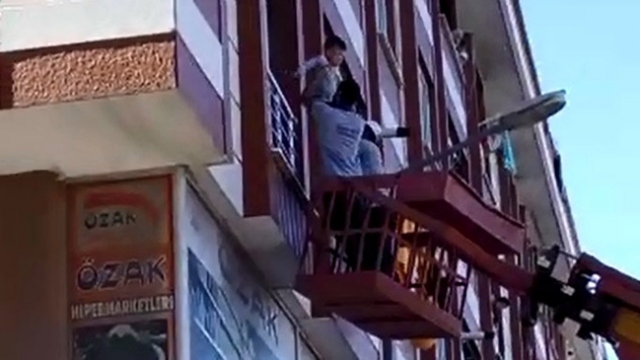İstanbul'un Sultangazi ilçesinde, bir evin penceresinden sarkan çocuk paniğe neden oldu. Komşuların haber vermesi üzerine olay yerine gelen vinç operatörü, çocuğu vinç sepetiyle kurtardı. O anlar kameraya yansıdı.