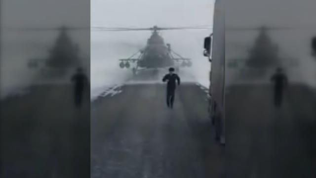 Kazakistan'da bir helikopter pilotu, kamyonete yol sormak için helikopterini indirdi.