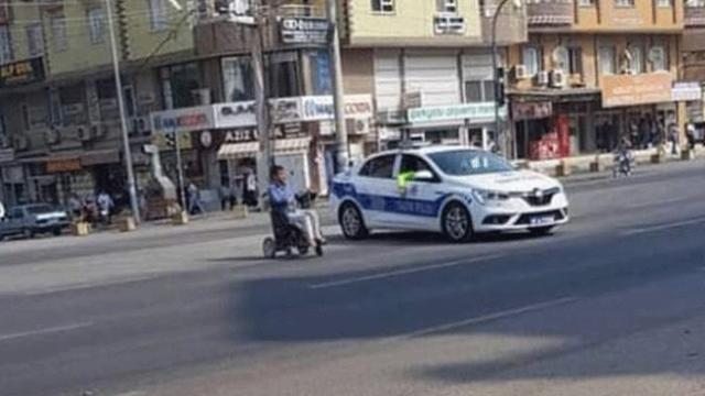 Mardin'in Kızıltepe ilçesinin işlek bir caddesinde, polis otomobilinin, yolun karşısına geçmeye çalışan tekerlekli sandalyedeki engelli vatandaşa siper olması güvenlik kamerasına yansıdı.