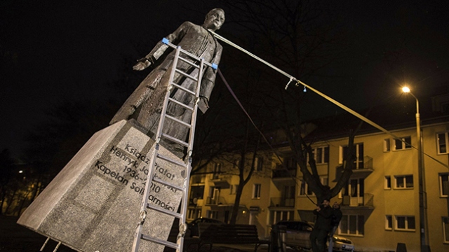 Polonyalı eylemciler çocuk istismarını protesto için rahip heykelini yıktı