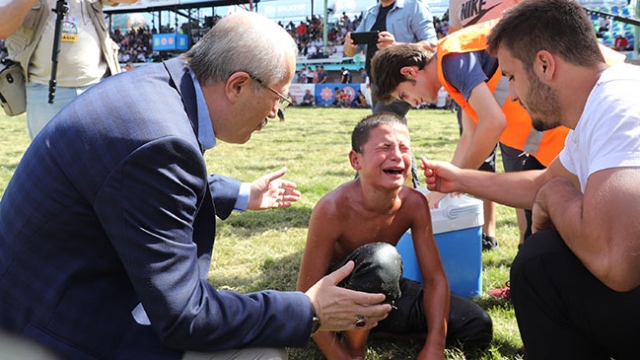Balıkesir'de düzenlenen 59. Kurtdereli Güreşleri'nde, minik 2 boyda güreşen Güven Can Türkoğlu, rakibine yenilince teselliyi Balıkesir Büyükşehir Belediye Başkanı yaptı.