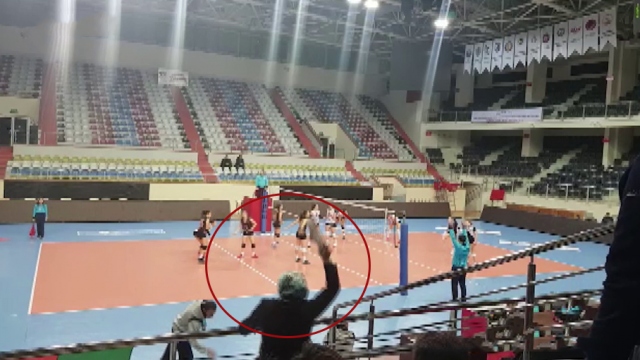 İzmir'de gençler voleybol ligi karşılaşmasını tribünden izleyen bir anne, rakip takım antrenörüne terlik fırlattı. O anlar kameralara yansıdı.