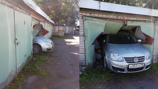 Rusya’da bir sürücü aracını garajına park ederken aracını geri vitese alıp gaza yüklenince komşusunun garajına daldı.