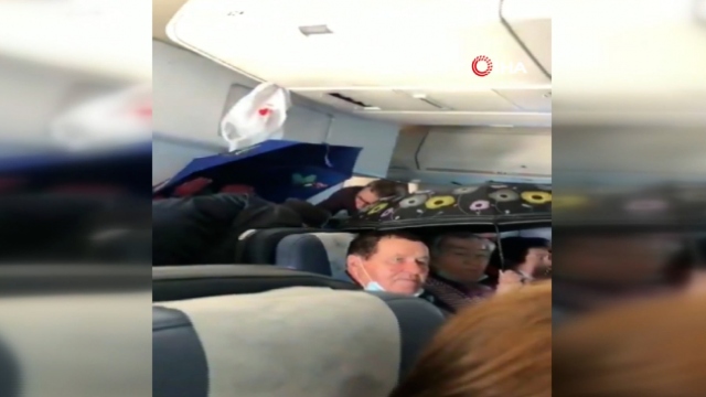 Rusya’da seyahat eden uçaktaki yolcular tavandan su akması nedeniyle şemsiyelerini açtı. Yolculardan biri o anları telefonuyla kaydetti.