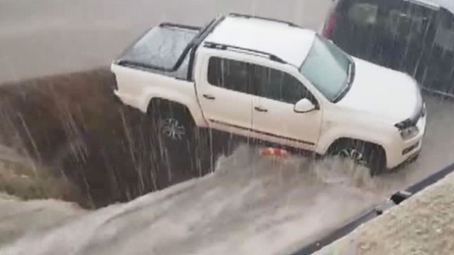 Erzurum'da meydana gelen şiddetli sağanakta yol çöktü. Oluşan dev çukura park halindeki bir araç düştü.