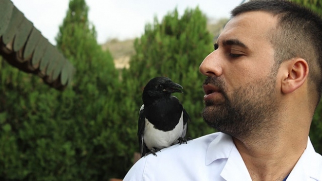 Saksağan kendisini tedavi eden veterinerden ayrılamıyor