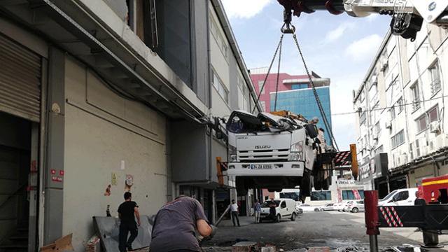 Beylikdüzü'nde Haramidere Sanayi Sitesi'ndeki bir iş yerine taşınan vinç halatların kopmasıyla düştü. Vincin düşme anı ise bir vatandaşın cep telefonu kamerasına yansıdı.