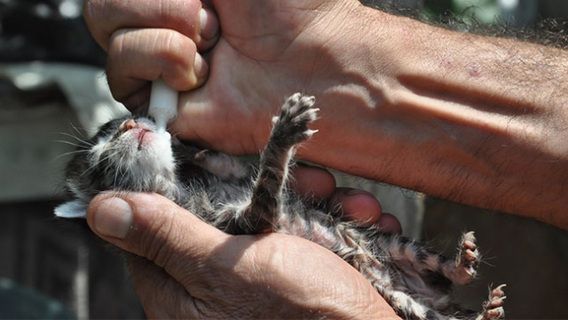 Sandıkta bulduğu kedi yavrularını şırıngayla besliyor