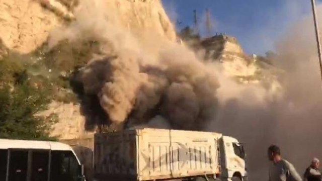 Şanlıurfa'nın Birecik ilçesinde meydana gelen heyelanı izleyen vatandaşlar, kayaların altında kalmaktan son anda kurtuldu.