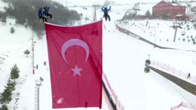 Erzurum'da İl Jandarma Komutanlığına bağlı arama kurtarma ekipleri, şehit askerler için Palandöken Kayak Merkezi'ne dev Türk bayrağı astı.