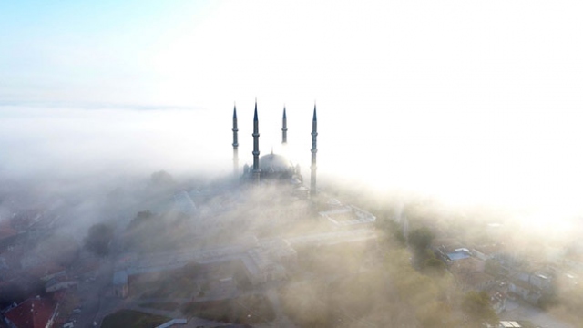 Edirne'de etkili olan sis nedeniyle başta Selimiye Camisi olmak üzere kentteki pek çok tarihi yapının muhteşem görüntüsü adeta büyüledi.