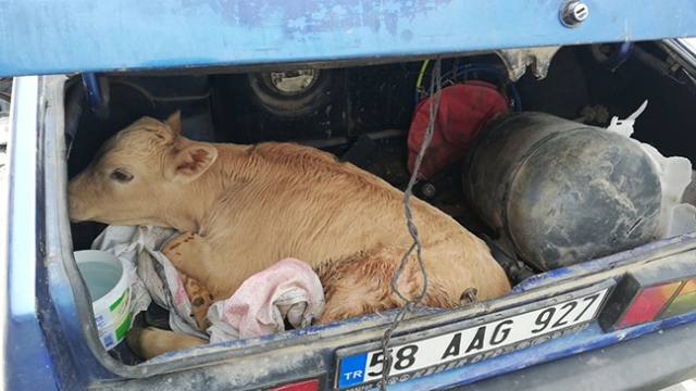 Sivas'ta trafik kazasına karışan otomobilin bagajından buzağı çıkması şaşkınlığa neden oldu.